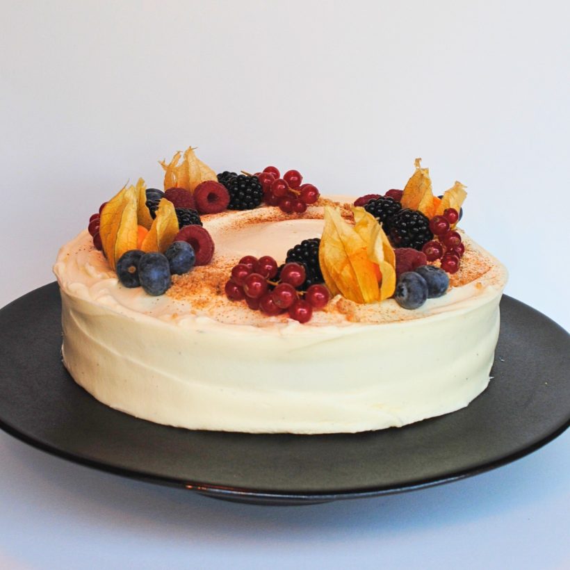 Maukas ja mehevä porkkanakakku koostuu kahdesta porkkanakakkupohjasta, joiden välissä ja pinnalla on runsaasti herkullista täytettä.