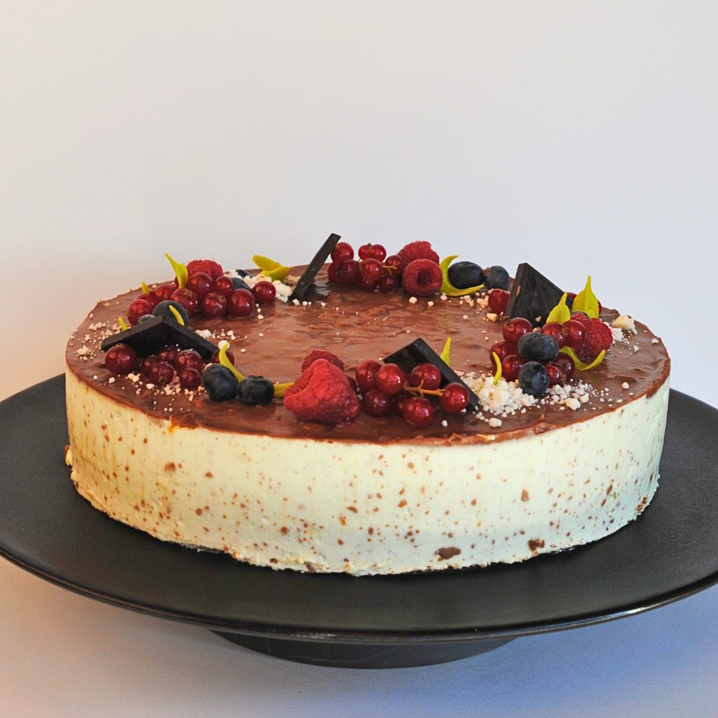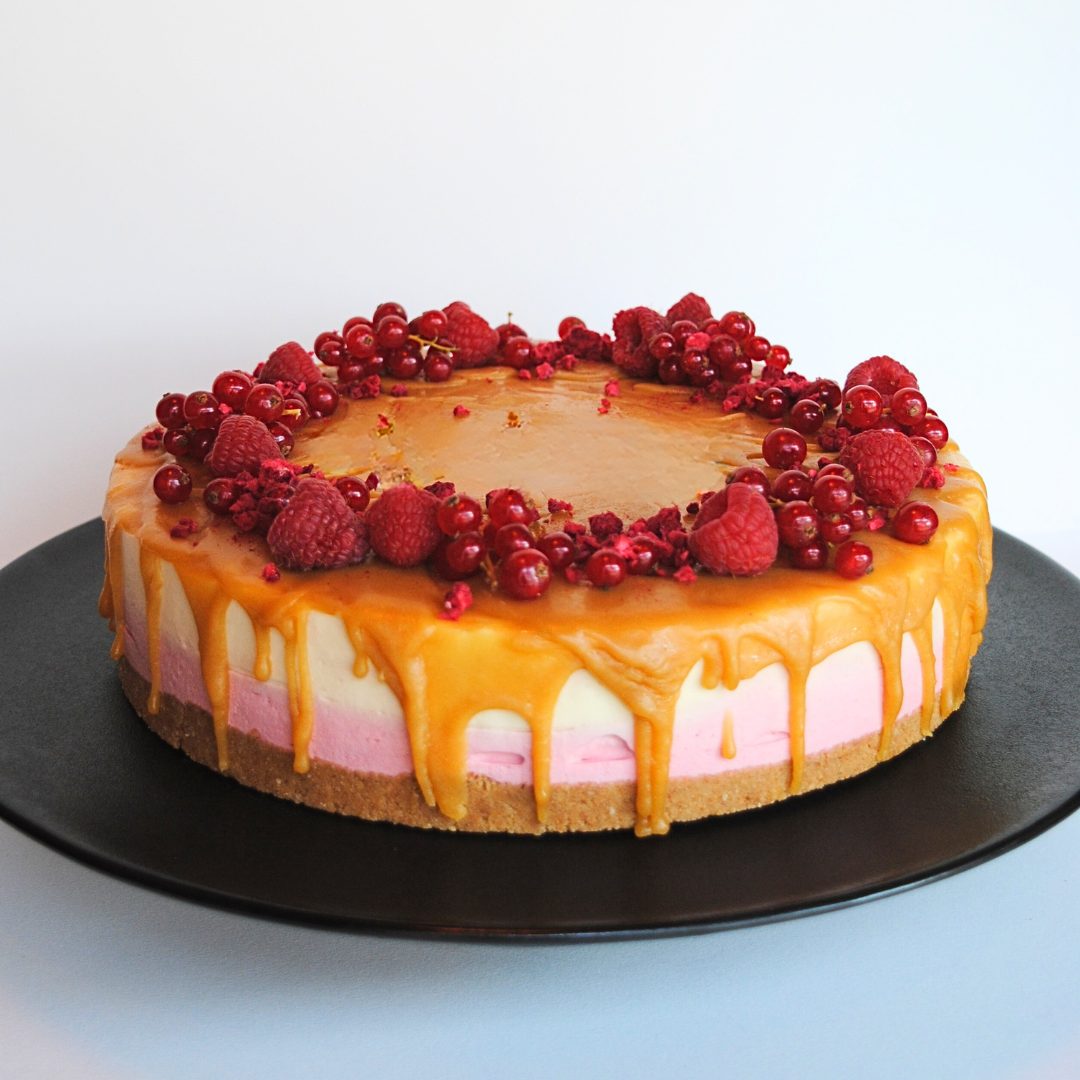 Pohjalla talon oma gluteeniton keksipohja ja täytteenä vadelmahilloketta, raikasta vadelmamoussea sekä täyteläistä kinuskimoussea. Kakun kruunaa herkullinen kinuskikuorrute.