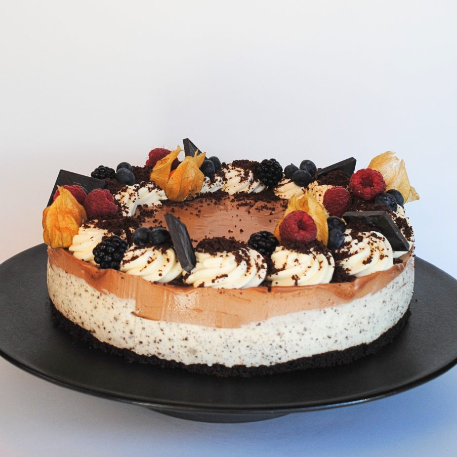 Ihastuttava suklainen kakku, jossa suklaakeksipohjan päällä on kerros keksimoussea ja silkkisen pehmeää maitosuklaamoussea. Kakku on viimeistelty valkosuklaapursoituksella.